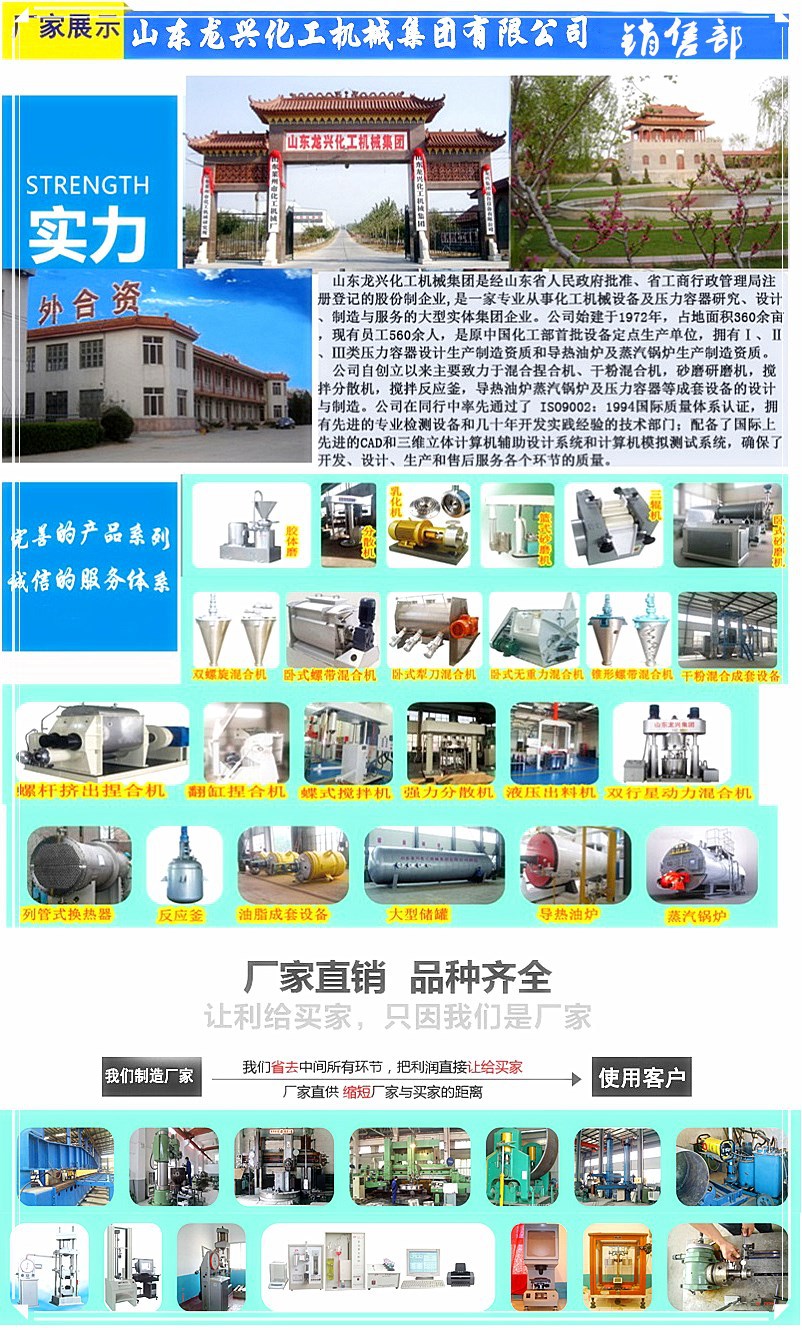山東龍興化工機(jī)械集團(tuán)憑借在業(yè)內(nèi)三十多年的技術(shù)積累和成長經(jīng)歷,已經(jīng)發(fā)展為集科研、開發(fā)、制造為一體的科技型集團(tuán)公司,主要業(yè)務(wù)涉及液體研磨機(jī)、攪拌分散機(jī),膏體混拌捏合機(jī)、雙行星動力攪拌混合機(jī),干粉攪拌混合機(jī),導(dǎo)熱油、蒸汽鍋爐、低溫容器及反應(yīng)釜罐和換熱器及一二三類壓力容器的設(shè)計(jì)與生產(chǎn)。同時(shí)我們承接行業(yè)用戶成套設(shè)備及生產(chǎn)線的設(shè)計(jì)制造業(yè)務(wù),龍興人愿與天下有識之士攜手共創(chuàng)新的輝煌。